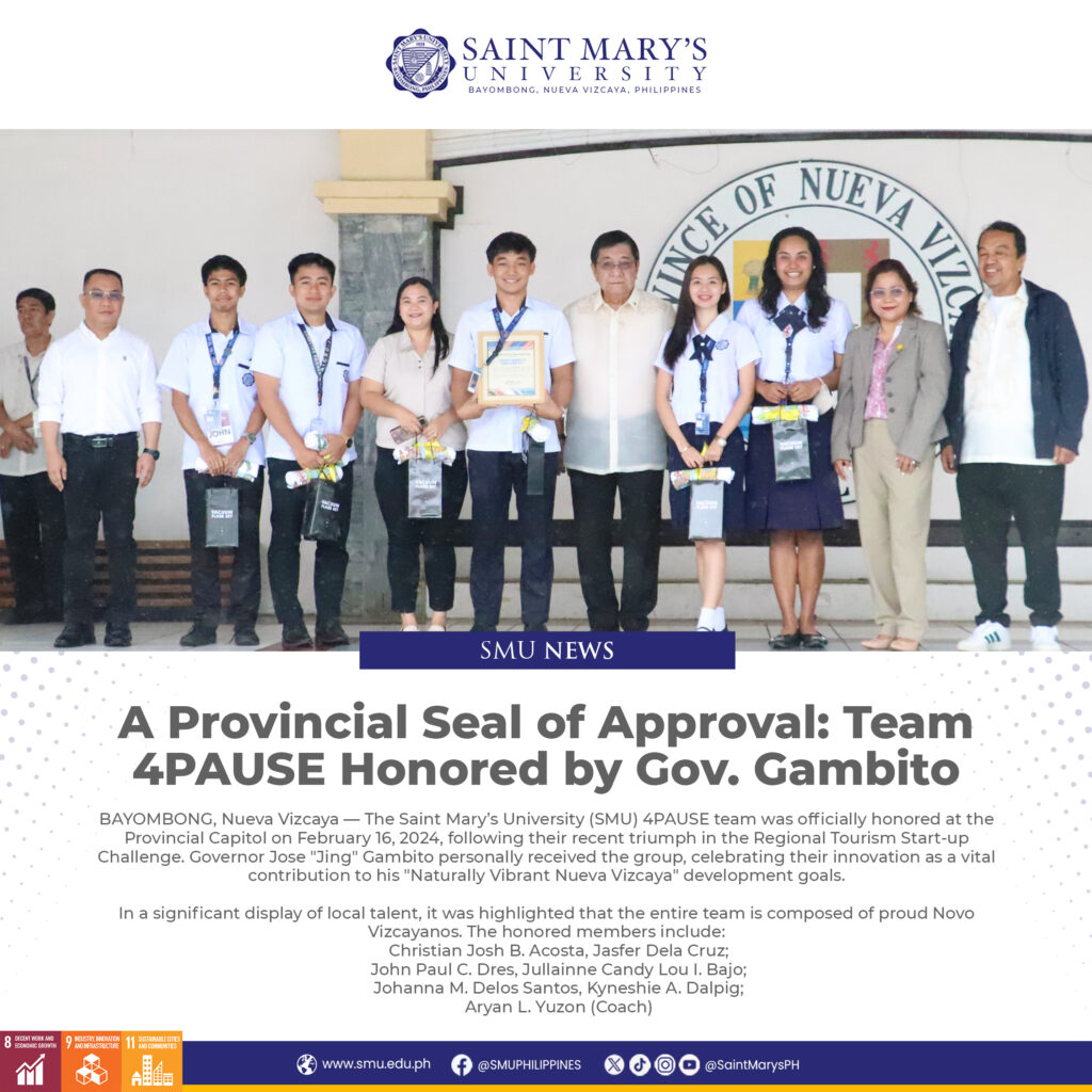 BAYOMBONG, Nueva Vizcaya — The Saint Mary’s University (SMU) 4PAUSE team was officially honored at the Provincial Capitol on February 16, 2024, following their recent triumph in the Regional Tourism Start-up Challenge. Governor Jose “Jing” Gambito personally received the group, celebrating their innovation as a vital contribution to his “Naturally Vibrant Nueva Vizcaya” development goals.