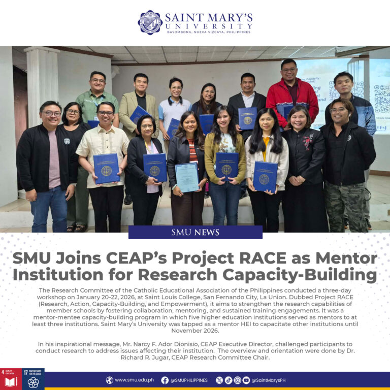 The SMU Choral Society is the premier Singing Group of the University. Its dictum “Concentus Opus Nostrum Est” (Harmony is our work), the SMU Choral Society is an Organization of musical inclined passionate students specializing in their own fields of endeavor in Education. This premier singing society of Saint Mary’s University of Bayombong Nueva Vizcaya, believes that singing is one of the greatest opportunities of self-expression. Members of this society come from the different neighboring province of Nueva Vizcaya whose passion and enthusiasm for musical blends their voice into one soulful harmony. The society aims to entertain and educate its audience with the vocal medium of auditory arts as its aims to professionalize its talents and the organization as a whole. Beyond all this, the SMU Choral Society will become one big team and express itself in a splendid, unified effort. Indeed, harmony, rhythm, melody, vocal color, dynamics, tempo, and text –all come together in one remarkable organization.