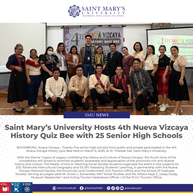 The SMU Choral Society is the premier Singing Group of the University. Its dictum “Concentus Opus Nostrum Est” (Harmony is our work), the SMU Choral Society is an Organization of musical inclined passionate students specializing in their own fields of endeavor in Education. This premier singing society of Saint Mary’s University of Bayombong Nueva Vizcaya, believes that singing is one of the greatest opportunities of self-expression. Members of this society come from the different neighboring province of Nueva Vizcaya whose passion and enthusiasm for musical blends their voice into one soulful harmony. The society aims to entertain and educate its audience with the vocal medium of auditory arts as its aims to professionalize its talents and the organization as a whole. Beyond all this, the SMU Choral Society will become one big team and express itself in a splendid, unified effort. Indeed, harmony, rhythm, melody, vocal color, dynamics, tempo, and text –all come together in one remarkable organization.