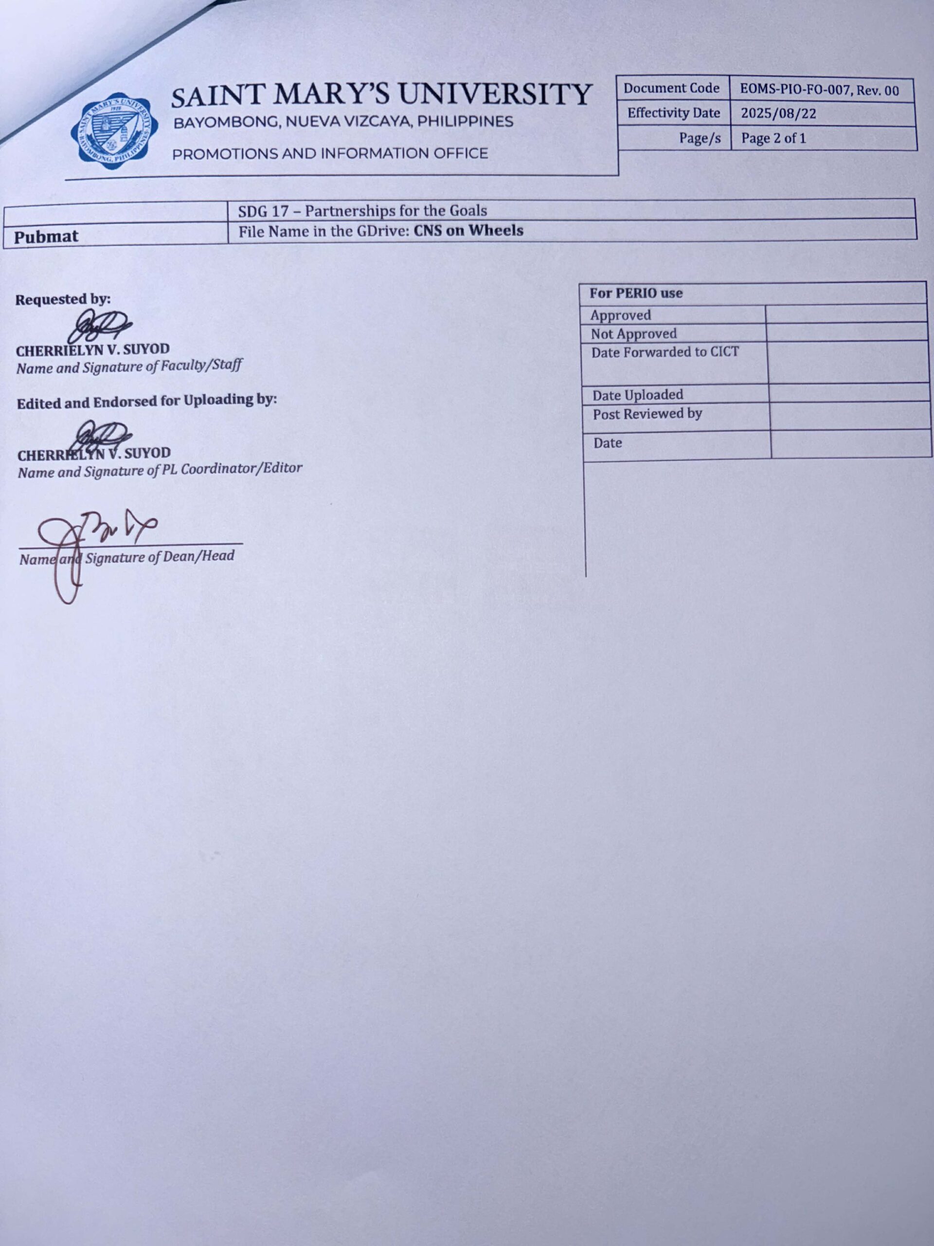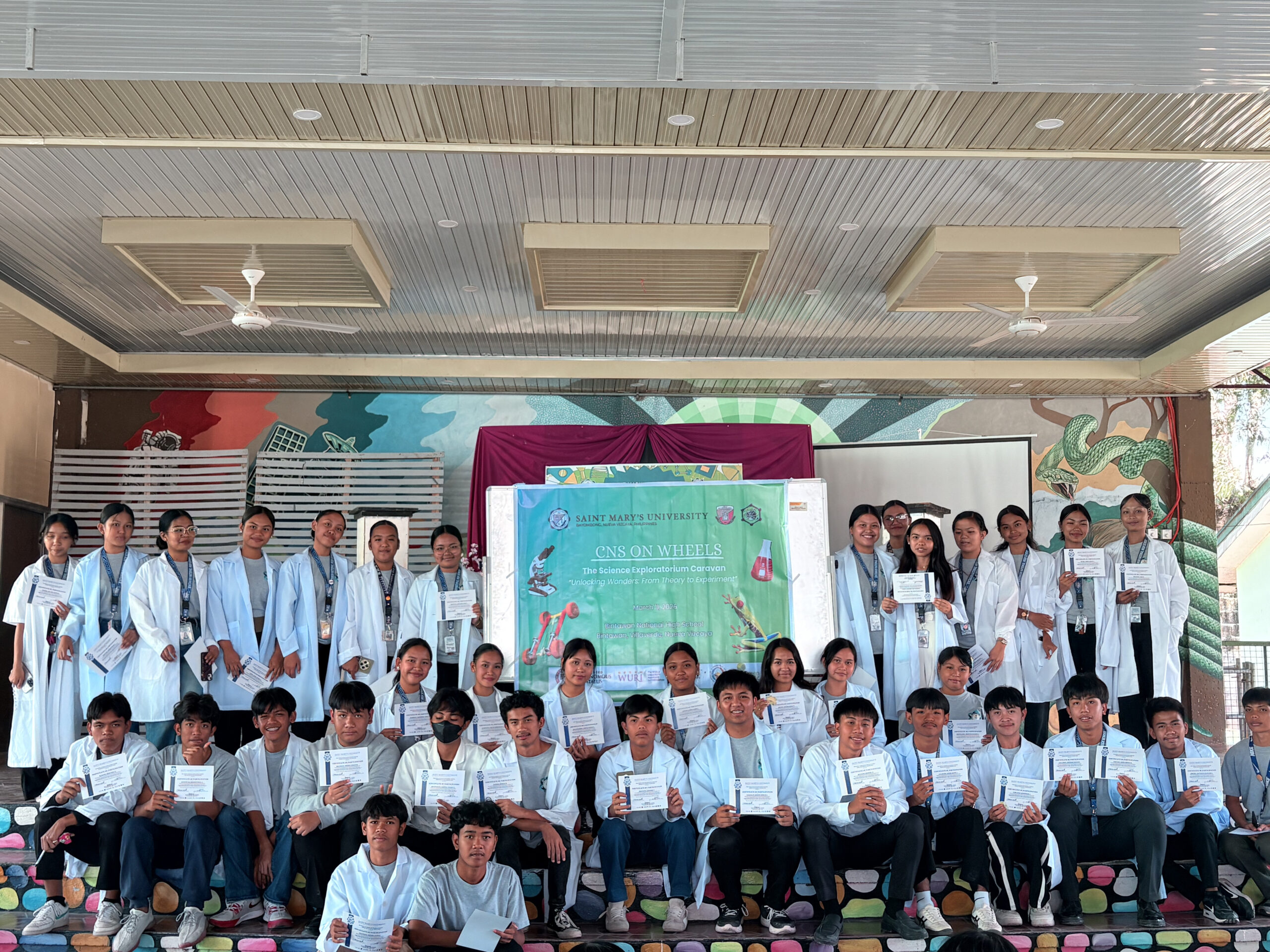 The School of Health and Natural Sciences- Center for Natural Sciences (CNS) conducted the “CNS on Wheels: The Science Exploratorium Caravan” at Bintawan National High School on March 11, 2026, engaging STEM students in interactive science learning activities. The said activity, which is one of the flagship projects of the Center for Natural Sciences, was spearheaded by Ms. Arcelle May Novida and Ms. Aila Laurice Panganiban under the guidance of Dr. Elsa Cajucom, CNS Director, and Dr. Christopher Allen Marquez, CEIPSC Director.
