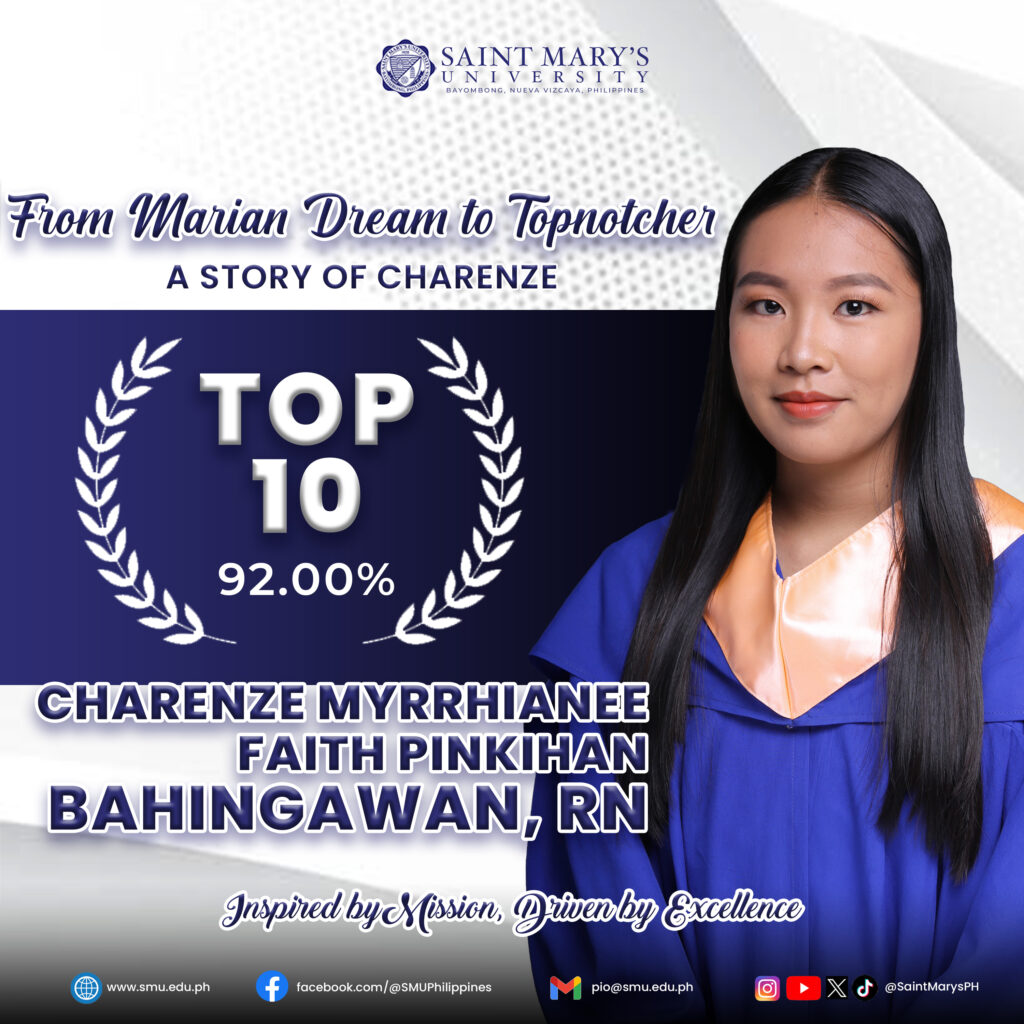 Saint Mary’s University proudly celebrates one of its newest achievements in nursing excellence as Charenze Myrrhianee Faith Pinkihan Bahingawan, RN, secures a spot in the Top 10 of the Philippine Nursing Licensure Examination. Her story is one of determination, faith, discipline, and a deep commitment to becoming the best nurse she can be, a journey that began the very moment she chose to be a Marian.