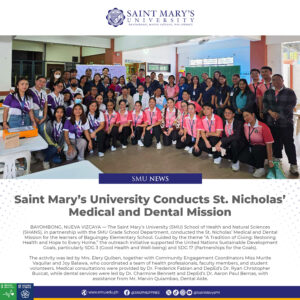 Saint Mary’s University Conducts St. Nicholas’ Medical and Dental Mission BAYOMBONG, NUEVA VIZCAYA — The Saint Mary’s University (SMU) School of Health and Natural Sciences (SHANS), in partnership with the SMU Grade School Department, conducted the St. Nicholas’ Medical and ...