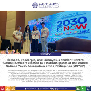 Hernaez, Policarpio, and Lumayas, 3 Student Central Council Officers elected to 3 national posts of the United Nations Youth Association of the Philippines (UNYAP) Saint Mary’s University sent four delegates to the “2030 IS NOW: The 1st Philippine Youth Convention ...