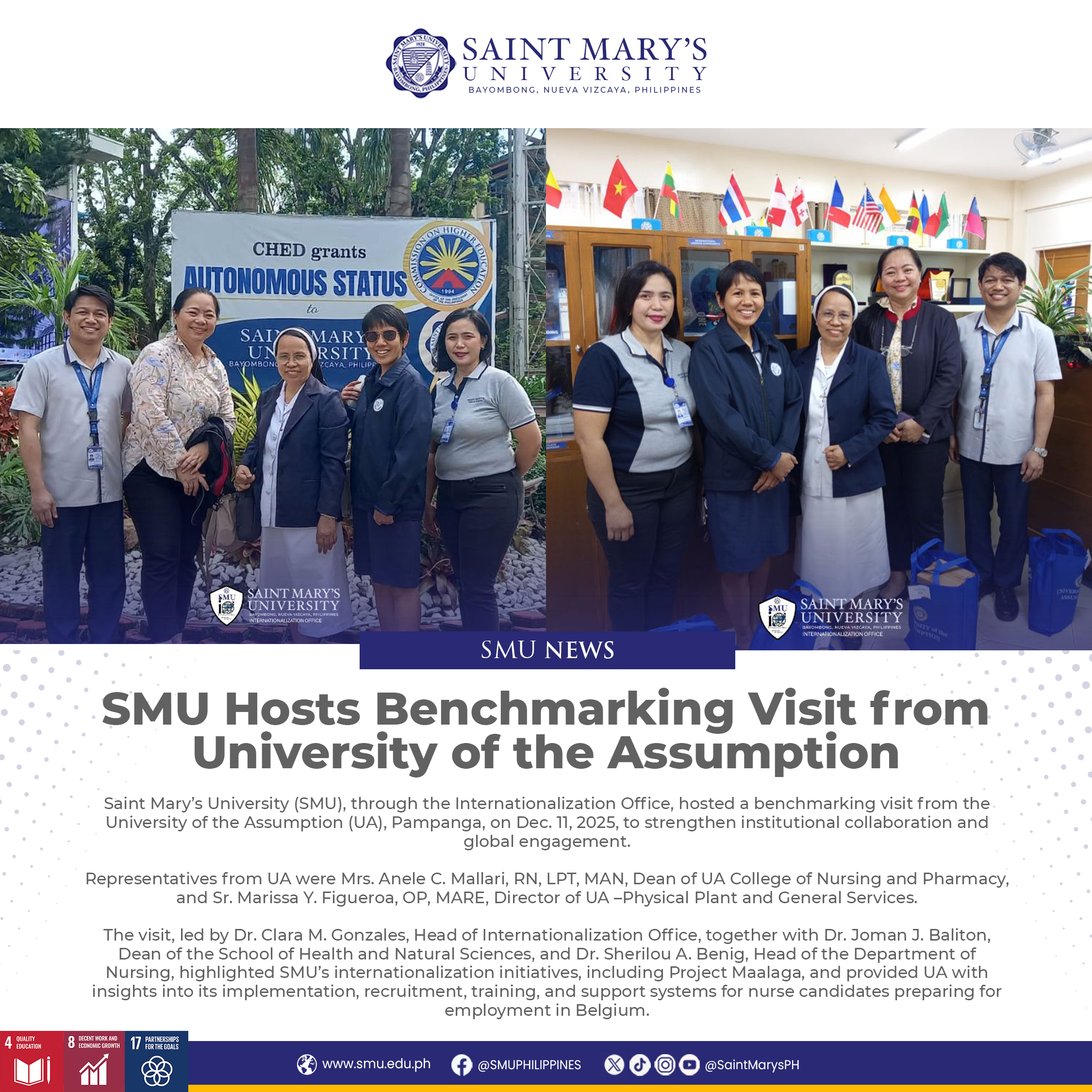 Saint Mary’s University (SMU), through the Internationalization Office, hosted a benchmarking visit from the University of the Assumption (UA), Pampanga, on Dec. 11, 2025, to strengthen institutional collaboration and global engagement.